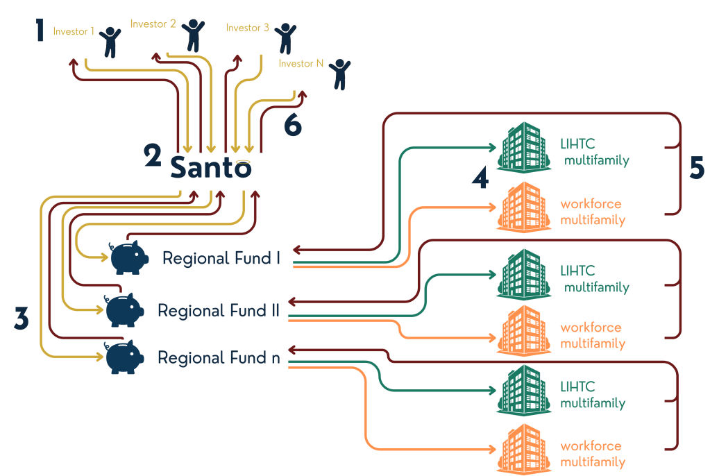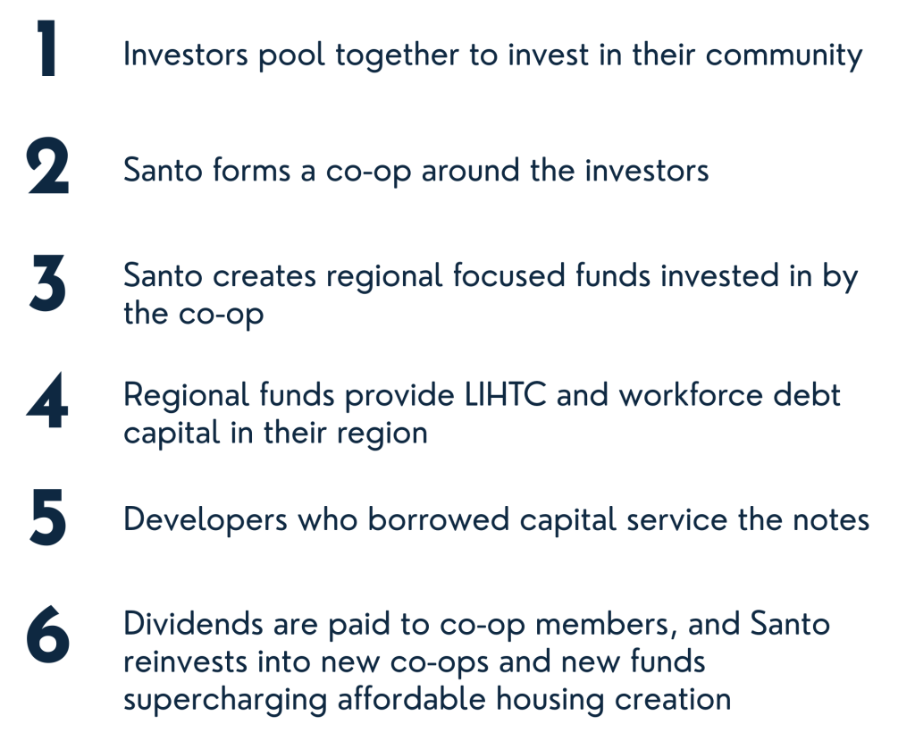 Santo operates a non-extractive impact investing model, which organizes investors, pools them into coops, and assures that the capital invested remains deployed into the community. As developers service the notes lent to their projects, the returned capital would be reinvested into new projects, making the investments available in perpetuity.