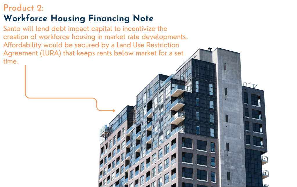 The second instrument Santo Coops would use are Workforce Housing Financing Notes. These notes would be made available to market rate developers working on workforce housing rental units, or to market rate developers who want to add workforce units to their project, but are struggling to do so financially. By securing affordability with a LURA (Land Use Restriction Agreement) Santo Coops can assure that units will remain affordable for years to come. Developers commit to maintain a proportion of the unit mix at affordable levels, and benefit from a lower cost of capital spread across market rate units.
